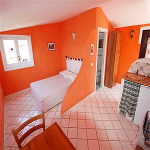 2-room apartment 55 m2 on 4th floor, with sloping ceilings, simple and cosy furnishings: 1 room with panoramic window with 1 double bed, 1 pull-out bed, kitchen corner, shower/bidet/WC and air conditioning. Exit to the terrace. 1 room with panoramic window with 1 double bed, kitchen corner, shower/bidet/WC and air conditioning. Exit to the terrace. Heating (extra), air-conditioning (extra). Large terrace. Terrace furniture, barbecue. View of the sea, the countryside and the resort. Facilities: Internet (WiFi, extra). Please note: fridge without freezer, no parking. No lift. The two bedrooms are two separate areas, connected only by the terrace.