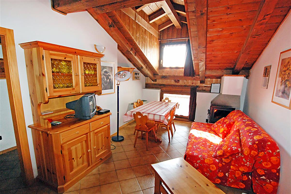 3-room apartment, partly with sloping ceilings, simple and comfortable furnishings: living/dining room with 1 double sofabed, open-hearth fireplace and digital TV. 1 room with 1 double bed. 1 room with 3 sleeping facilities. Kitchenette (4 hot plates, freezer) with dining table and dining nook. Shower/bidet/WC. Gas heating, boiler. View of the mountains, the valley and the resort.