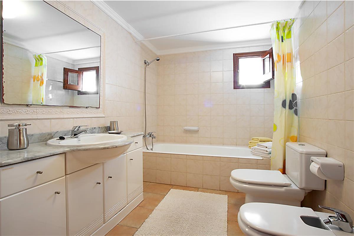 Port de Pollença: Comfortable apartment block "Urb Bóquer Port Pollença", built in 1997. In the district of Bóquer, in the resort 100 m from the centre of Puerto Pollença, in a sunny position, 100 m from the sea, located by a road. Private: garden (fenced) with lawn 100 m2. Terrace, garden furniture. In the house: laundry. Stepped path (5 steps) to the house. Public parking on the road. Shop 100 m, grocery 200 m, supermarket 1 km, shopping centre, restaurant, bus stop 100 m, sandy beach "Platja d'Albercuix" 100 m, outdoor swimming pool 300 m. Golf course 14 km. On request: airport transfer to the holiday accommodation.
