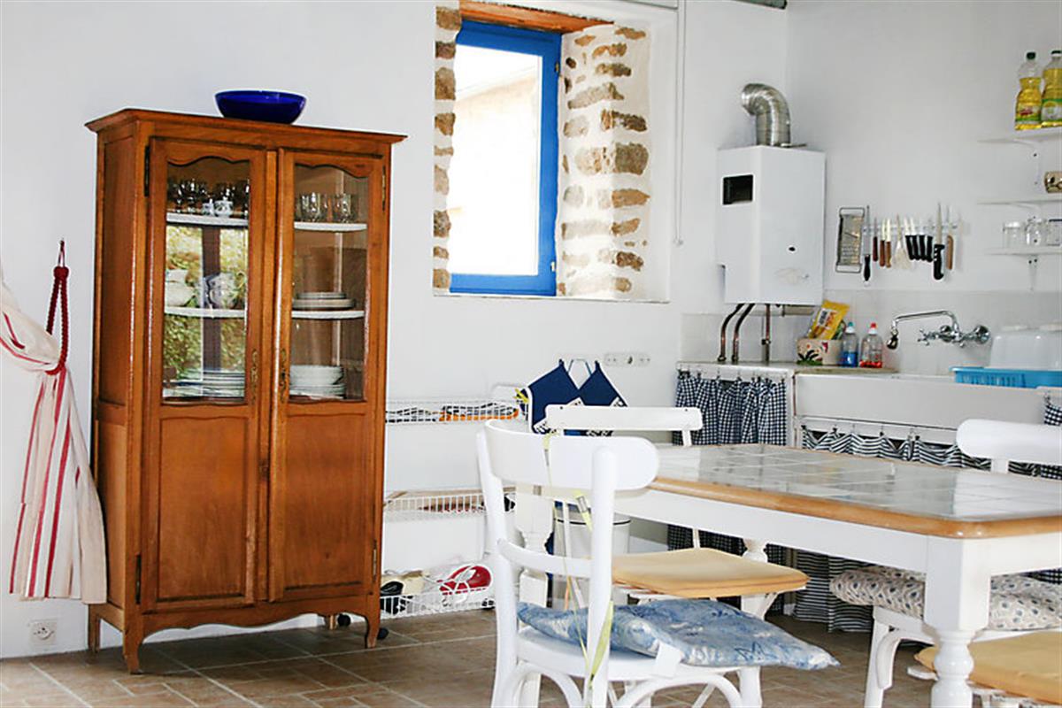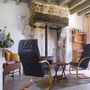 2-room house 80 m2 on 2 levels. Simple and practical furnishings: small living room with TV, radio and wood-burning stove. Exit to the garden. Open kitchen (4 hot plates, oven, freezer, electric coffee machine) with dining table. Shower/WC. Wood heating. Upper floor: (steep stair), 1 open large room with sloping ceilings with 1 double bed (140 cm, length 200 cm). Terrace. Terrace furniture, deck chairs (2). 1 small pet/ dog allowed.