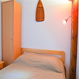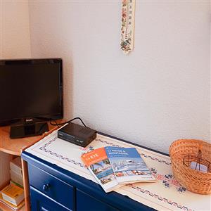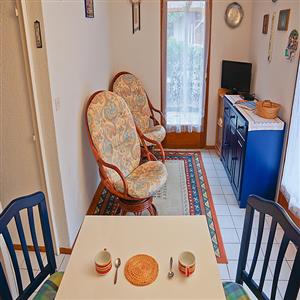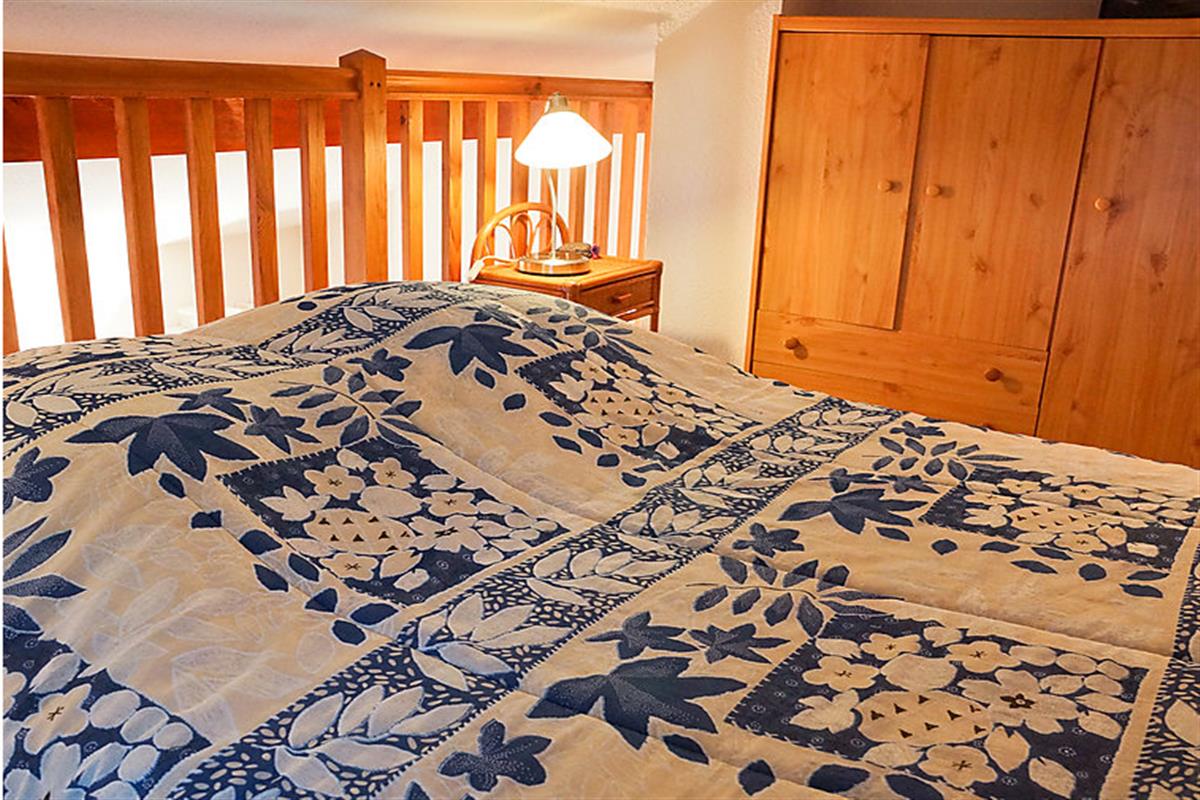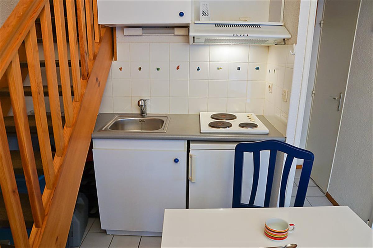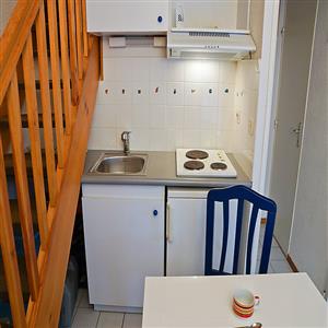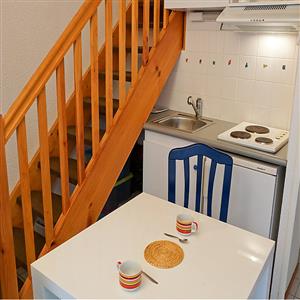 2-room terraced house 32 m2 on 2 levels: living/dining room with TV and flat screen. Exit to the terrace. 1 room with 1 double bed (140 cm, length 190 cm). Kitchenette (3 hot plates, mini-oven). Shower/WC. Electric heating. Upper floor: gallery, with sloping ceilings, ceiling height 190 - 80 cm with 1 double bed (140 cm, length 190 cm). Terrace roofed, north facing position, large terrace, east facing position. Terrace furniture. Facilities: washing machine. Reserved parking space n 18.