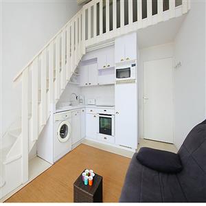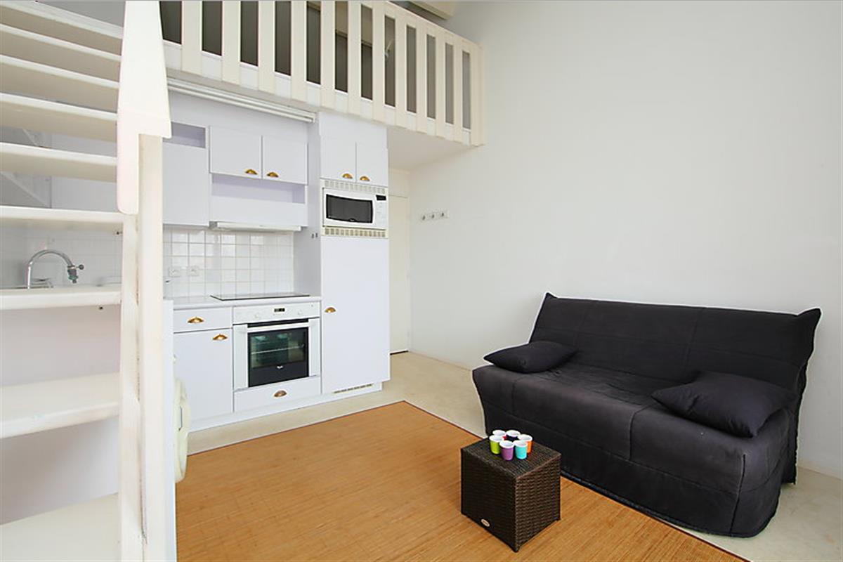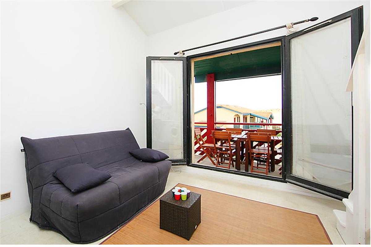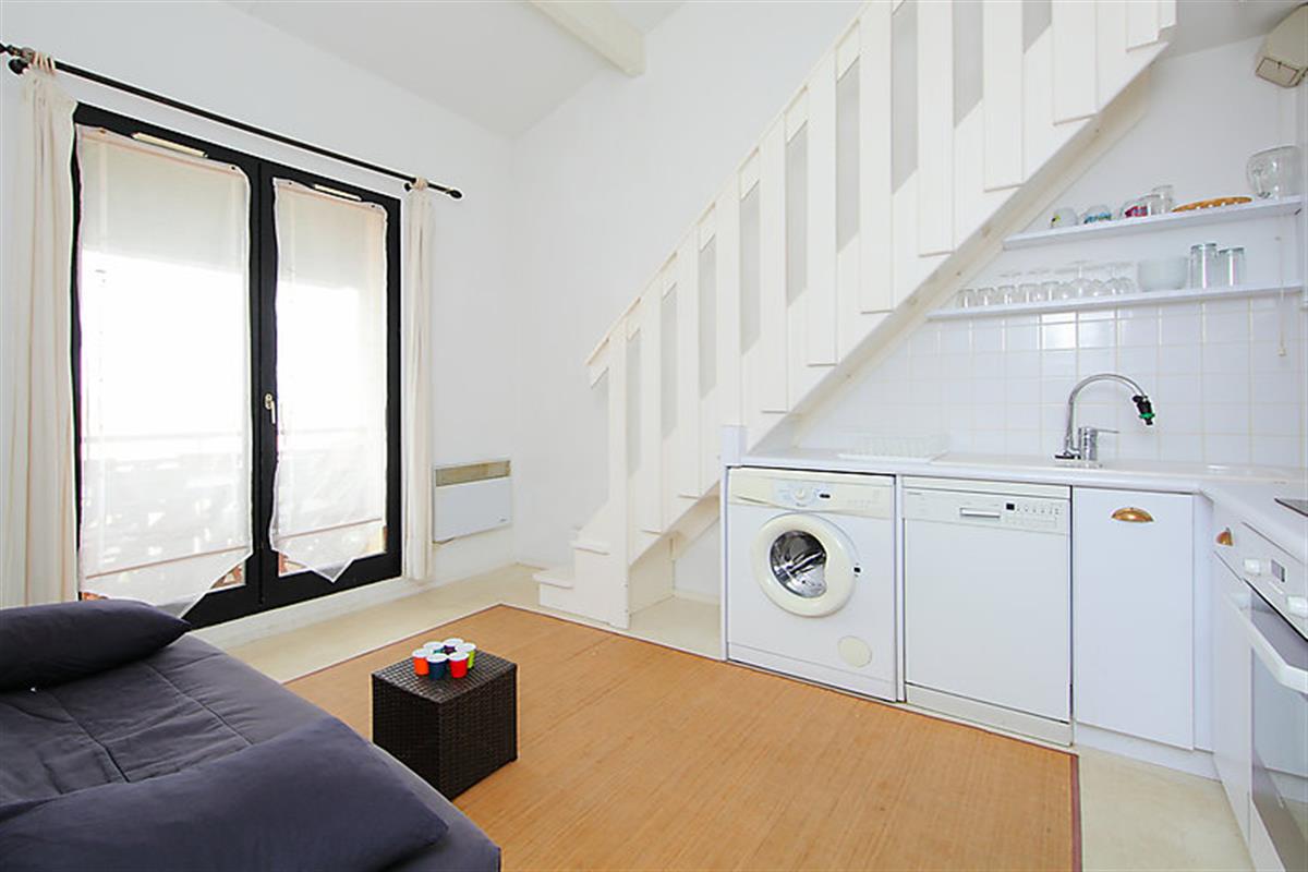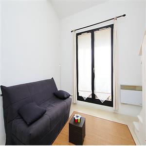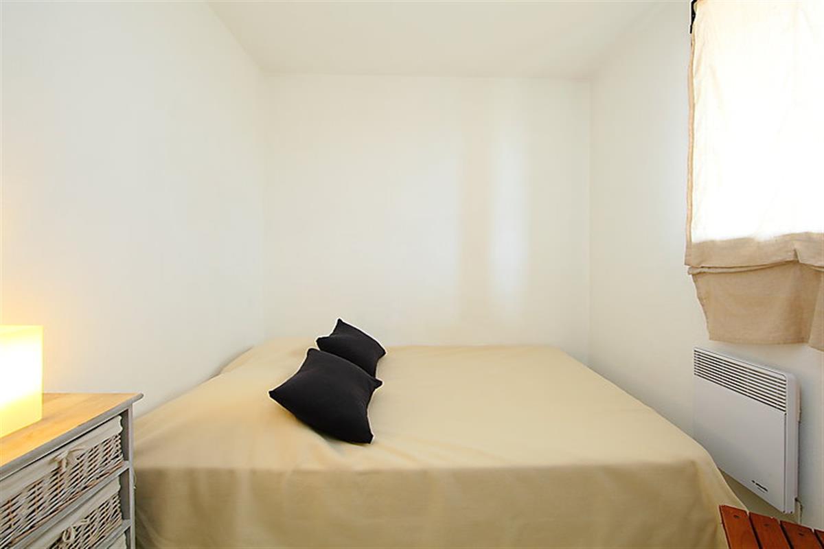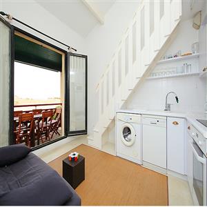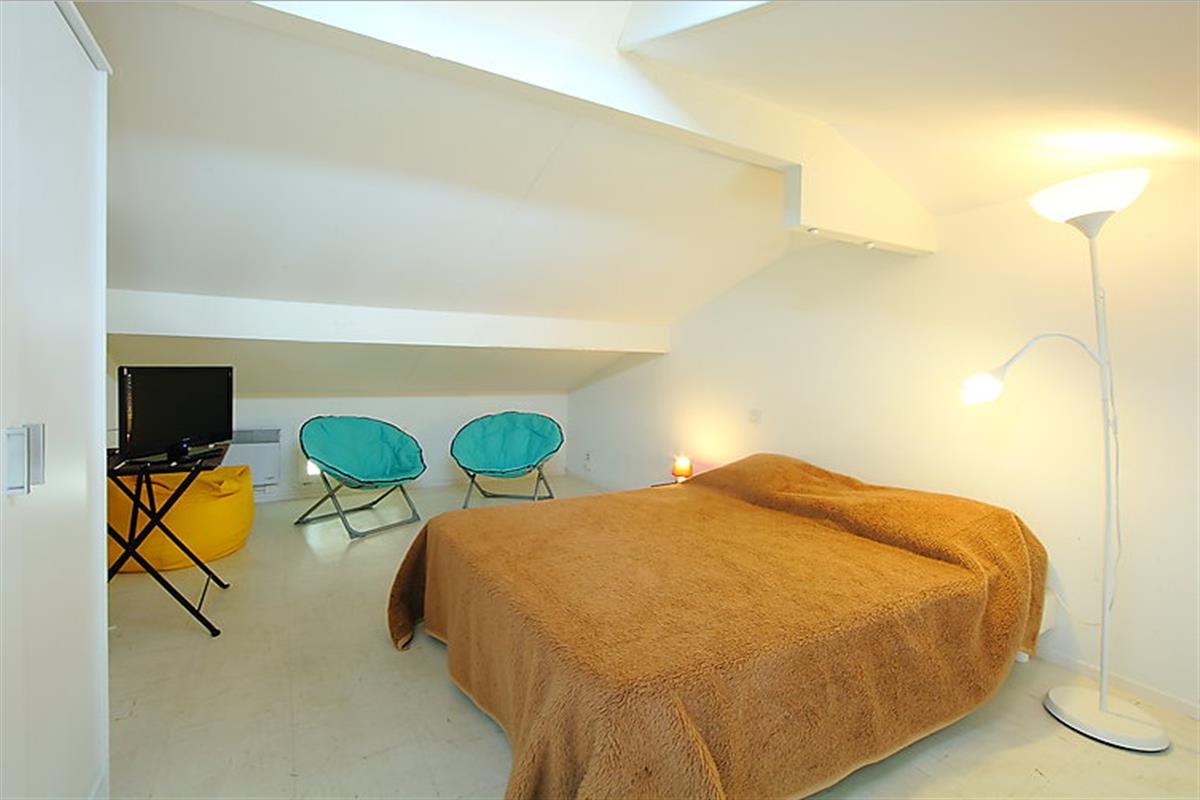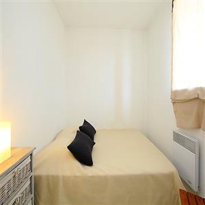 2-room maisonette south facing position, bright, practical furnishings: 1 room 5 m2 with 1 double bed (1 x 140 cm, length 190 cm). Small living room with 1 sofabed (120 cm, length 190 cm), TV. Exit to the balcony. Kitchenette (oven, dishwasher, 4 ceramic glass hob hotplates, microwave) with dining table, separate WC. Shower. Upper floor: gallery, open, with sloping ceilings, ceiling height 135 - 195 cm with rooflight with 1 double bed (1 x 140 cm, length 190 cm). Very beautiful view of the sea. Facilities: washing machine. Reserved parking space n 74.