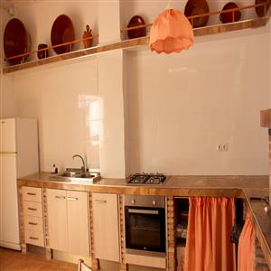The fully equipped kitchen with all the crockery, glassware and cutlery needed for 12 people. It includes a dishwasher, microwave, fridge freezer, fryer, butane burner and oven, Italian and electric coffee maker, kettle, blender, and other kitchen utensils. Next to the kitchen there is a small pantry room, for easy placement and organization of all purchases.