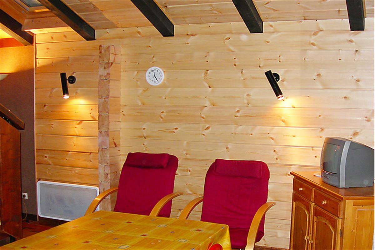 2-room chalet 50 m2 on 3 levels: living/dining room with 1 double sofabed, open-hearth fireplace and TV. Sep. WC. On the lower ground floor: kitchen-/living room (3 hot plates, oven). Bathroom. Upper floor: gallery with 1 bed. 1 small room with 1 double bed. Terrace. Terrace furniture, barbecue. Maximum 1 pet/ dog allowed. Electric heating charged per units used, to be paid for on site.